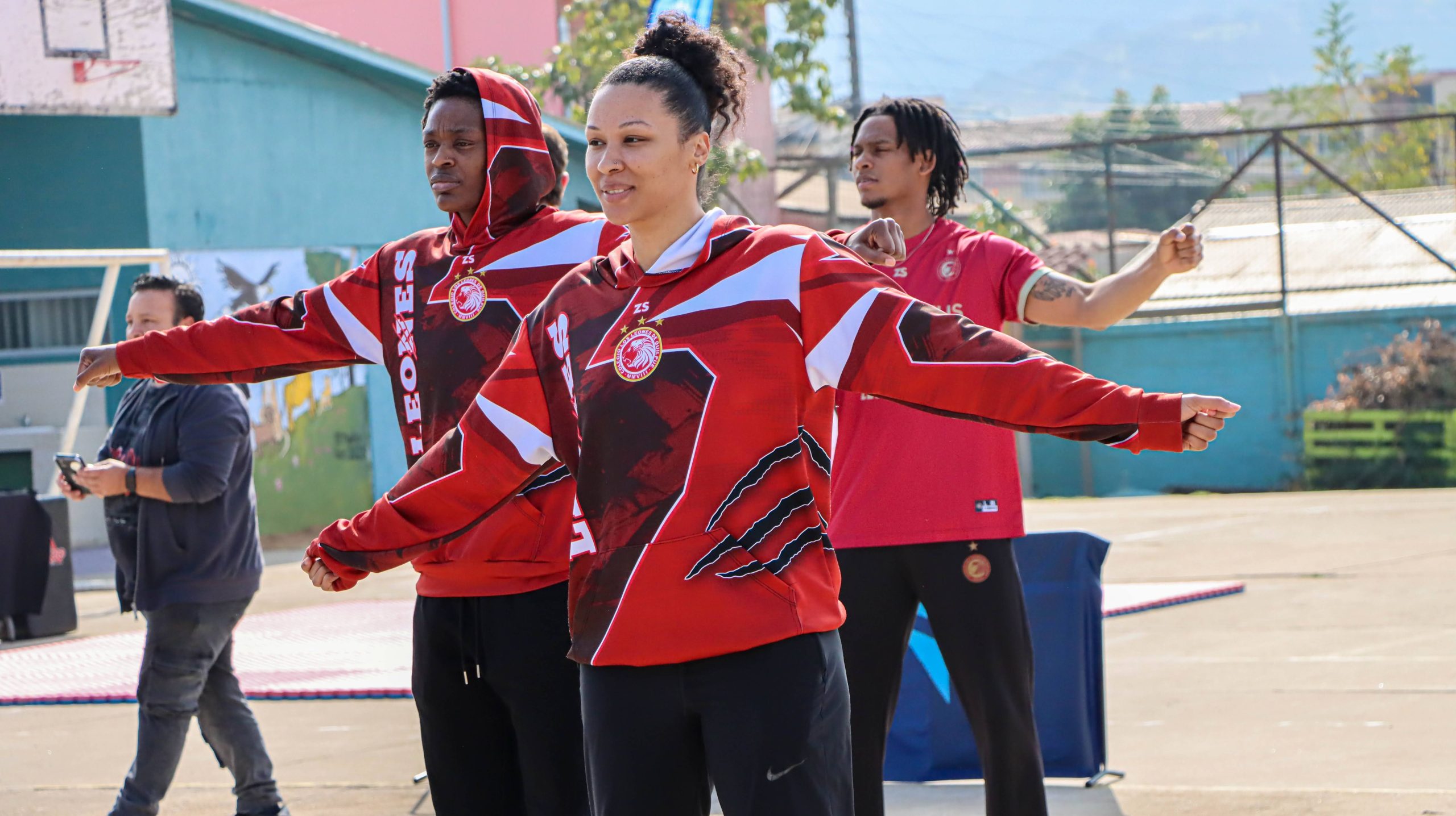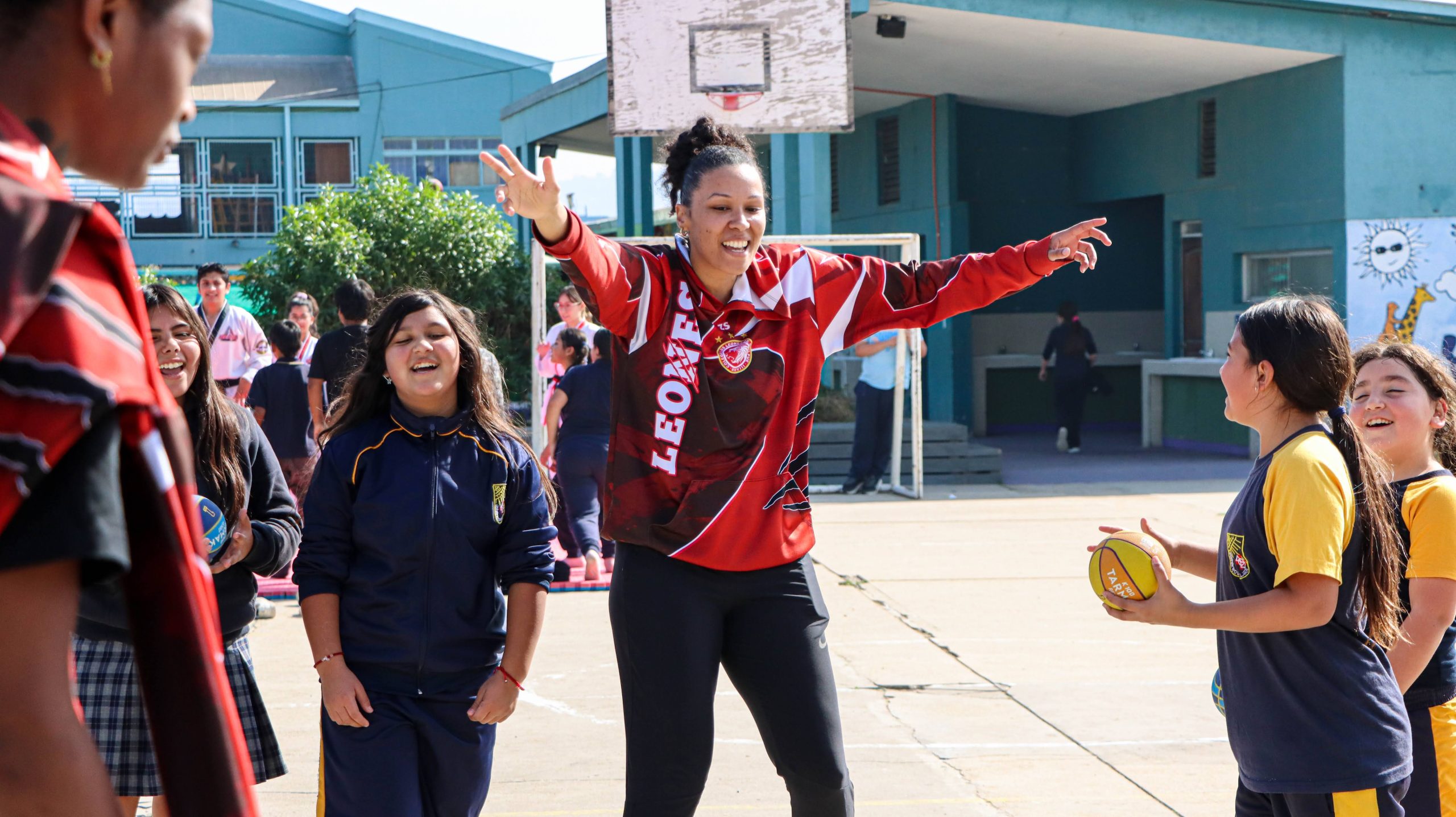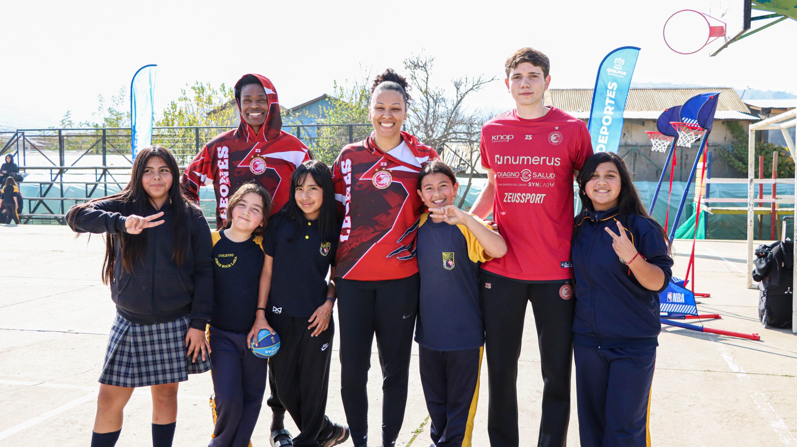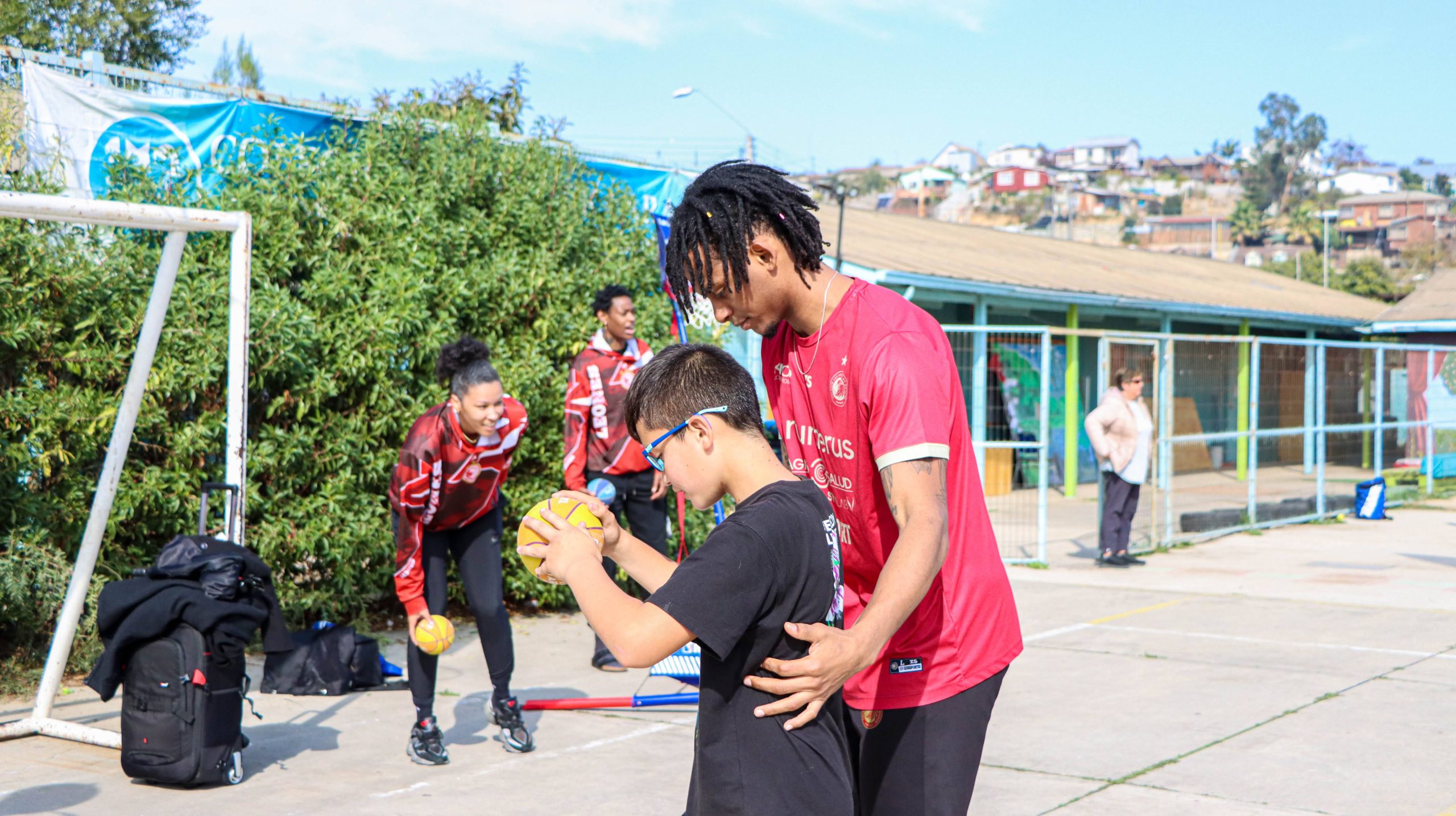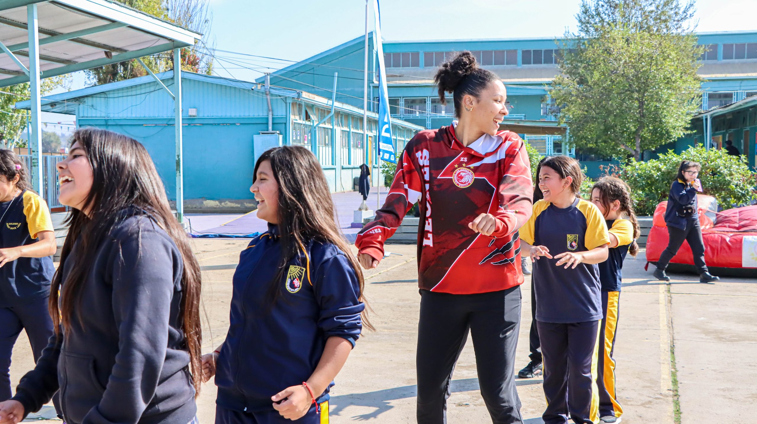 Los jugadores Sergio Mijares y Gabriel García junto a las jugadoras Alexus Johnson y Akilah Bethel, participaron de las actividades, enseñándoles a los niños y niñas del colegio sobre técnica y habilidades en el básquetbol.